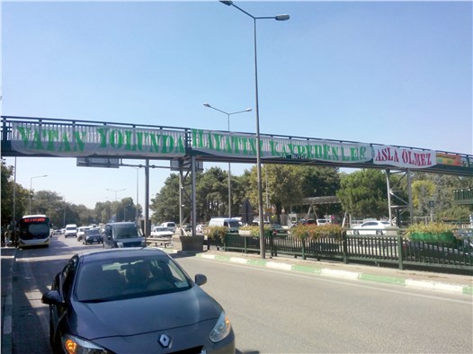 Bursaspor taraftar gruplarından Grup 1963’ün tarafından asılan üç parça bez pankartta, “Vatan yolunda hayatını kaybedenler asla ölmez” yazıldı. Merinos kavşağında araç sürücülerinin yanı sıra yayaların da dikkatini çeken pankart, beğeni topladı.