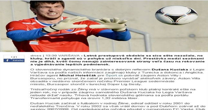 Slovakya'nın Sport.aktuality.sk sitesinde yer alan habere göre, yeşil-beyazlı ekip, Dusan Kuciak'ın transferi için çalışmalara hız verdi. Bu sezon Legia Varşova forması giyen 30 yaşındaki kaleci, toplam 52 resmi maçta 40 gol yemiş ve 25 maçta kalesini gole kapatmayı başarmış. Bursaspor'un ilgisinin yanı sıra, İngiltere'nin Aston Villa takımının da Kuciak ile ilgilendiği bildirildi.