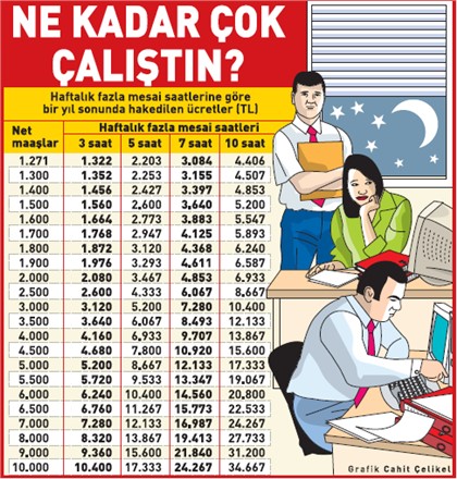 4857 sayılı İş Kanunu’na göre; haftalık çalışma saati 45 saat. 45 saati aşan süre ise fazla mesaiye giriyor. Fazla çalışma için verilecek ücret, normal çalışma ücretinin saat başına düşen miktarının yüzde 50 fazlası oluyor. Örneğin; saatlik ücret 10 liraysa, saatlik fazla mesai ücreti 15 lira oluyor. İşveren fazla mesai yaptırmak için işçiden her yıl başında yazılı onay almalı. Aksi durumda işçiye, iş akdini feshetme hakkı doğuyor.