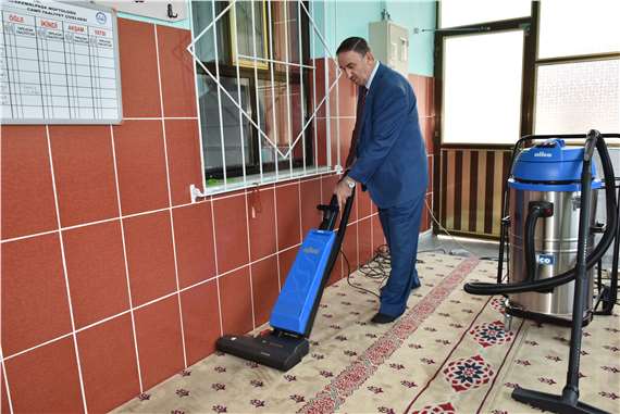 İbadethanelerin temizliği için alınan üç adet halı yıkama makinesinin kullanıldığı çalışmaları denetleyen Belediye Başkanı Sadi Kurtulan, bir program dahilinde tüm camilerin elden geçirileceğini söyledi.