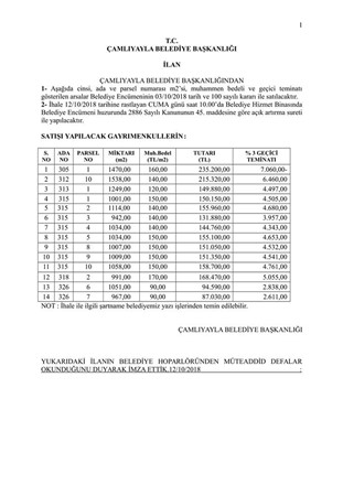 Çamlıyayla Belediyesi ilçeye bağlı Ardıçlı Mevkinde bulunan bazı arsalar için satış ihalesi düzenleyecek. Yapılan açıklamada ihalenin 12/10/2018 tarihinde saat 10.00'da Çamlıyayla Belediyesi Hizmet Salonunda yapılacağı duyruldu. İŞTE SATILIK ARSALAR VE DİĞER