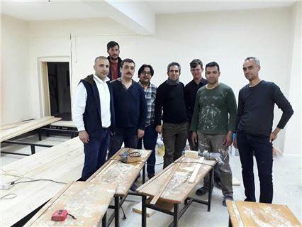 İslam öğretmen ve ekibini, kimi zaman boya yaparken, kimi zaman ise sıraların tadilatını yaparken görebilirsiniz.