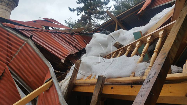 Ekipler kapanan yolları açtıkça, ulaşılan onlarca yaylalık evin çatısının çöktüğü görülüyor.
