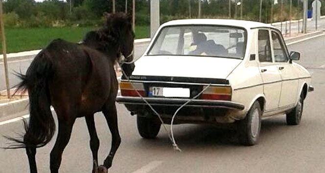 Şekerpınar mevkiinde meydana gelen olayda, bir otomobilin arka kısmına bağlanan at dikkat çekti. Otomobil sürücüsü, atı araca bağlı bir şekilde meraklı bakışlara aldırmadan yoluna devam etti. Bu ilginç manzarayı gören vatandaşlar, atın durumuna üzülerek cep telefonlarıyla o anları kaydetti.