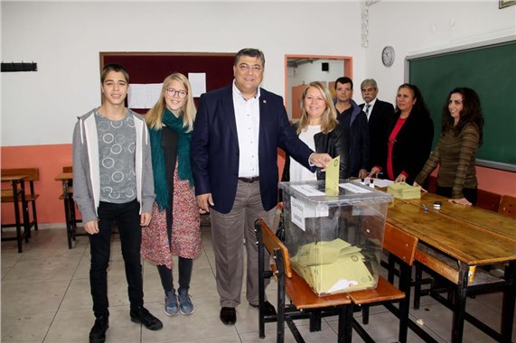 bölge adayı Kamil Okyay Sındır, oyunu doğup büyüdüğü Bornova ilçesindeki Cem Bakioğlu Anadolu Lisesi’nde, 1224 numaralı sandıkta kullandı