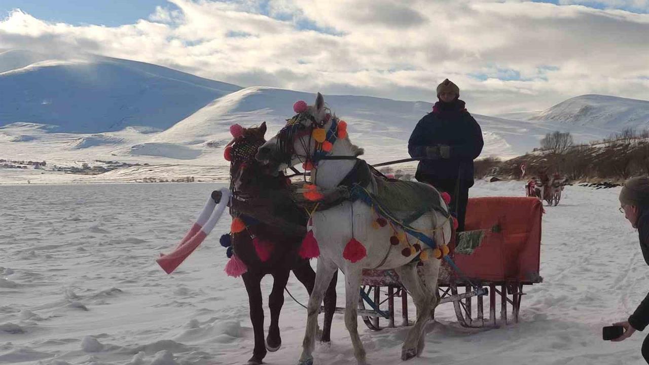 Çıldır Gölü'nde yerli ve yabancı turistler, buz üzerinde halay çekip atlı kızakla gezinti yaptı. Dondurucu soğuklar nedeniyle tamamen donan göl, kış turizmi için ideal bir ortam sunuyor.