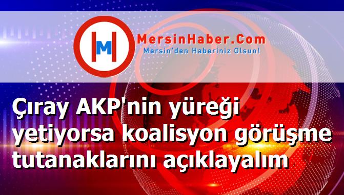 İZMİR - CHP İzmir Milletvekili ve Parti Meclisi Üyesi Aytun Çıray, Başbakan Ahmet Davutoğlu'nun, "CHP koalisyon kurmak istemedi." yönündeki açıklamalarına tepki gösterdi. CHP Genel Başkanı Kemal Kılıçdaroğlu'nun, ülkeyi düştüğü darboğazdan çıkarmak için özverili bir koalisyon çalışması yürüttüğünü söyleyen Çıray, "AKP’nin yüreği yetiyorsa koalisyon görüşme tutanaklarını açıklayalım. Kimin haklı olduğunu halk da öğrensin.” dedi.