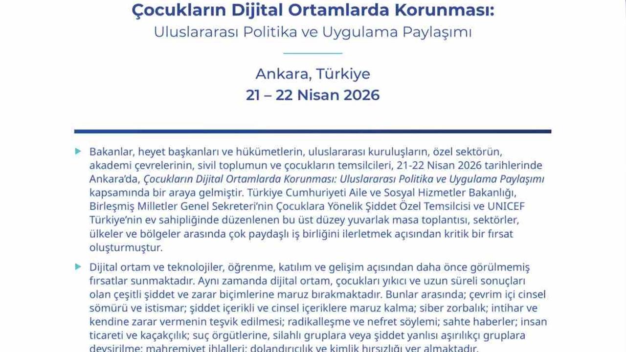 21-22 Nisan tarihlerinde Aile ve Sosyal Hizmetler Bakanlığı'nın ev sahipliğinde, Birleşmiş Milletler Çocuk Fonu (UNICEF) ve Birleşmiş Milletler (BM) Genel Sekreteri Çocuklara Yönelik Şiddet Özel Temsilciliği iş birliğiyle düzenlenen program, dijital dünyada çocukların güvenliğinin sağlanması üzerine yoğunlaştı. İki gün süren toplantının ardından, çocukların dijital haklarının korunmasına yönelik öncelik alanları ve çözüm önerileri içeren bir sonuç bildirisi yayımlandı. Bu bildiride, çevrim içi platformlarda çocukların güvenliğinin sağlanması için ortak bir irade oluşturulması gerektiği vurgulandı.