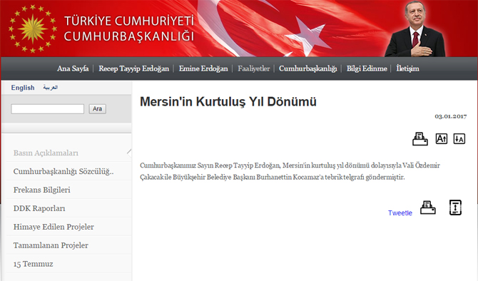 Cumhurbaşkanı Recep Tayyip Erdoğan, Mersin'in kurtuluş yıl dönümünü kutladı.