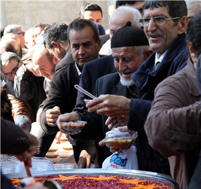 Öğle Namazı’nın ardından yapılan aşure dağıtımına Bursalılar yoğun ilgi gösterdi. Cumhurbaşkanlığı forsunda yer alan 16 yıldızın işlendiği dev kazandaki aşure, kısa sürede dağıtıldı. Aşure dağıtımını Cumhurbaşkanlığı Genel Sekreter yardımcısı Metin Kıratlı ile Büyükşehir Belediye Başkanı Recep Altepe gerçekleştirdi.
