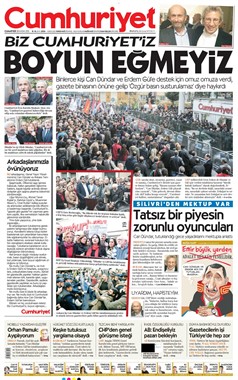 İSTANBUL - Cumhuriyet gazetesi, Genel Yayın Yönetmeni Can Dündar ve Ankara temsilcisi Erdem Gül'ün tutuklanmasıyla ilgili bildiri yayınladı. ‘Arkadaşlarımızla övünüyoruz’ başlıklı bildiride, “Şaşırmadık. Öfkemizi aşıp işimize bakacak, halkın gerçekleri öğrenme hakkını, kapalı kapılar ardında dönen dolapları gün ışığına çıkarma ödevimizi sürdüreceğiz.” ifadelerine yer verildi.