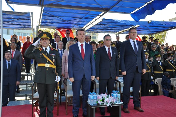 Protokol mensupları daha sonra Şehit Hamdibey Meydanı’na geçti. Buradaki program, saygı duruşu ve İstiklâl Marşı’yla başladı. Kaymakam Sırmalı, Garnizon Komutanı Ünlü ve Başkan Saka, halkın bayramını kutladı. Günün anlam ve önemini belirten bir konuşma yapan Sırmalı, "Savaştan çıkmış, yanmış, yıkılmış, yokluklar içindeki bir ülkenin, demokratik bir rejimle nereden nereye gelebileceğini en güzel biçimde gözler önüne sermektedir. Türkiye Cumhuriyeti, yok edilmek istenen bir ulusun bağımsızlığına kavuşmak, yeni bir devlet oluşturmak amacıyla giriştiği savaşın sonucu kurulmuştur. Cumhuriyetin ilanı, milletimizin şanlı tarihindeki en önemli dönüm noktalarından biridir. Cumhuriyet, birlik ve beraberlik içinde hareket ettiğimizde olmaz denileni başardığımızın ispatıdır. Atatürk’ün kurduğu cumhuriyet, Türkiye’nin çağdaş ve demokratik bir ülke olarak varlığını ve gelişimini sürdürmesinin en önemli güvencesidir. Aydınlık yarınlara ulaşılmasında en büyük güvencemiz, Türk ulusunun birlik ve beraberlik ruhu, yurdunu ve bağımsızlığını her şeyin üstünde tutan yaşam felsefesidir. Cumhuriyetimizin tüm değerleriyle sonsuza kadar yaşatılması, hepimizin ortak sorumluluğudur. Cumhuriyet, bizi geleceğe bağlayan en önemli halkadır. Cumhuriyet yeni ufuklar, aydınlık bir gelecek, pırıl pırıl genç zihinler demektir. Yüce Türk milletinin şanlı tarihinde ulaştığı en parlak, en muhteşem zirvedir. Bizlere düşen görev, Atatürk’ün önderliğinde büyük Türk milletinin kanı, canı ve sonsuz emekleriyle kurulan cumhuriyetimizi, tüm değerleriyle sonsuza değin yaşatmaktır.” dedi.