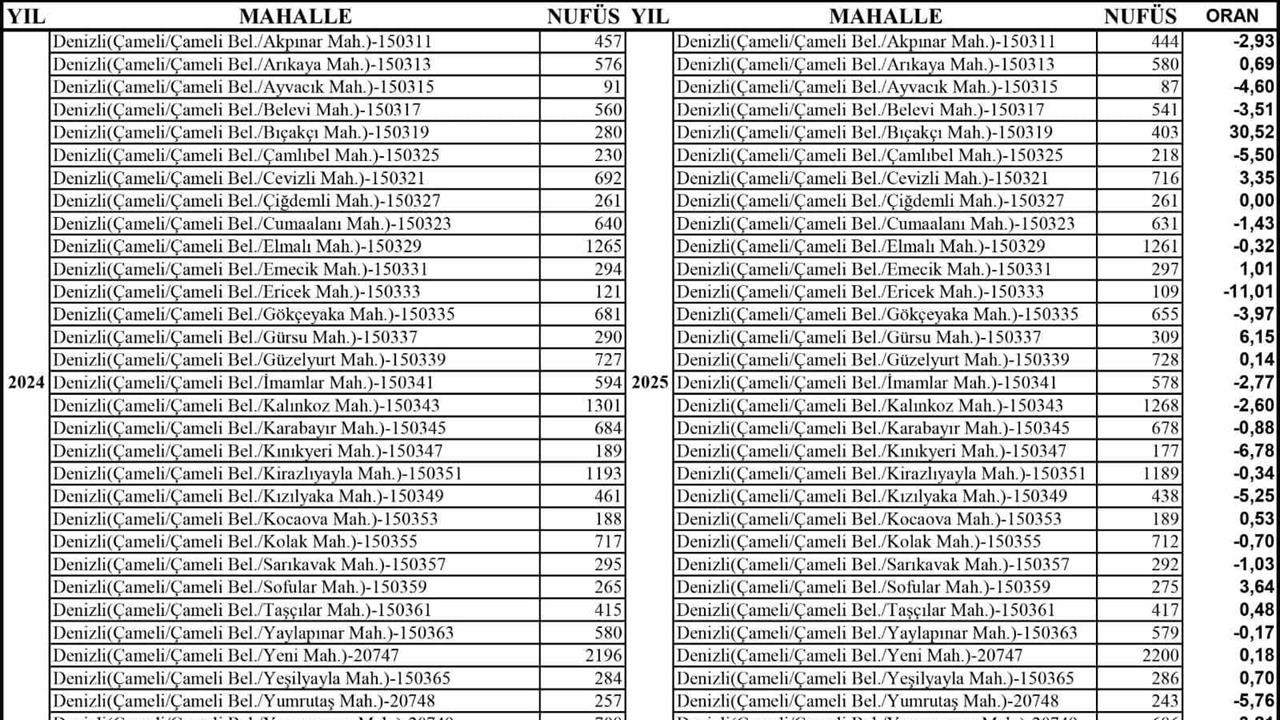 Türkiye İstatistik Kurumu (TÜİK) verilerine göre, Denizli'nin Çameli ilçesinin nüfusu 2025 yılı itibarıyla 17 bin 447 olarak kaydedildi. Bu durum, 2024 yılına göre 45 kişilik bir azalma yaşandığını ortaya koyuyor. Çameli Belediye Başkanı Cengiz Arslan, nüfus verilerini değerlendirirken, ilçenin huzurlu ve dengeli yapısının Sakin Şehir (Cittaslow) vizyonuyla uyumlu olduğunu vurguladı.