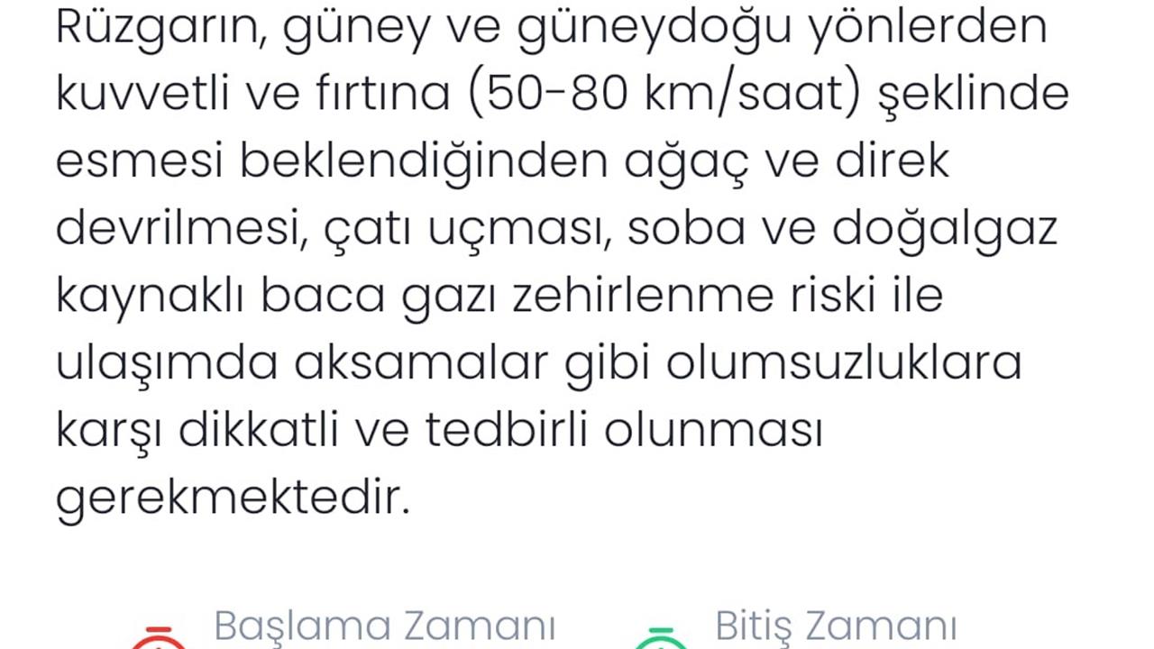 Meteoroloji Genel Müdürlüğü, Denizli ilinde rüzgarın güney ve güneydoğu yönlerinden kuvvetli bir şekilde, yer yer fırtına şeklinde (50-80 km/saat) esmesinin beklendiğini duyurdu. Bu nedenle, olumsuz hava koşulları sonucunda ağaç ve direk devrilmesi, çatı uçması, soba ve doğalgaz kaynaklı baca gazı zehirlenmeleri gibi tehlikelerin yanı sıra ulaşımda aksamalar yaşanabileceği ifade edildi. Bu sebeple, vatandaşların dikkatli ve tedbirli olmaları gerektiği vurgulandı. Yapılan uyarının 28 Mart 2026 tarihinde saat 11.10'da başlaması ve aynı gün saat 19.00'a kadar sürmesi bekleniyor.