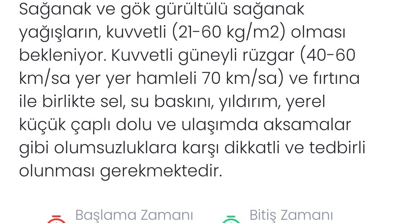 Yapılan açıklamada, Denizli'de metrekareye 21-60 kilogram arasında yağış düşmesinin beklendiği belirtilirken, güneyli rüzgarın da saatte 40-60 km hızla eseceği, yer yer 70 km/sa hızla fırtına oluşturabileceği vurgulandı. Bu durumun, sel, su baskını, yıldırım, küçük çaplı dolu ve ulaşımda aksamalar gibi olumsuzluklara yol açabileceği ifade edildi.