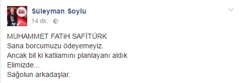"Muhammet Fatih Safitürk Sana borcumuzu ödeyemeyiz. Ancak bil ki katliamını planlayanı aldık. Elimizde... Sağolun arkadaşlar" dedi.