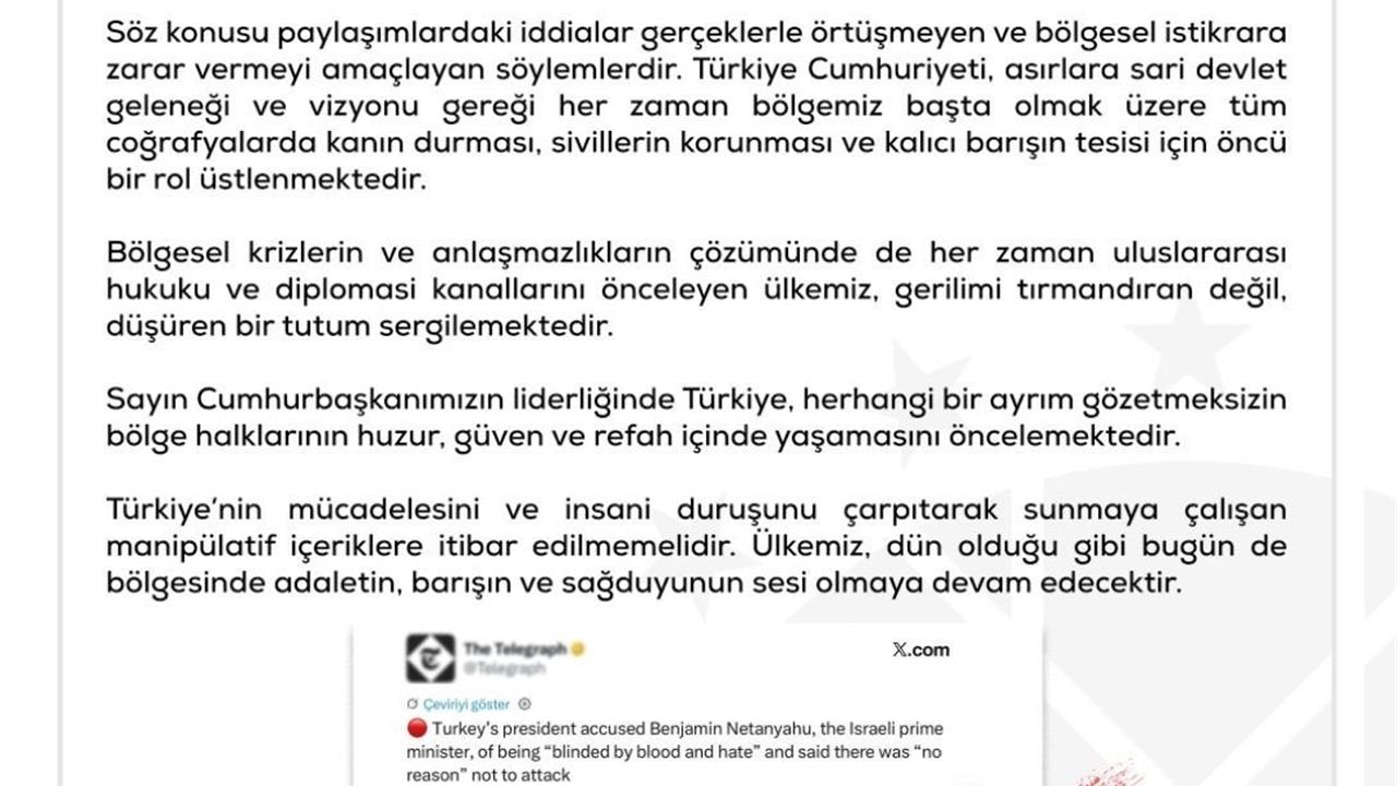"Birçok medya organı ve sosyal medya platformunda Cumhurbaşkanımıza atıfta bulunarak yapılan 'Türkiye’nin İsrail’e yönelik işgal tehdidinde bulunduğu' iddiaları gerçeği yansıtmamaktadır. Bu paylaşımlar, gerçeklerle örtüşmeyen ve bölgesel istikrarı tehlikeye atan söylemler içermektedir. Türkiye Cumhuriyeti, köklü devlet geleneği ve vizyonu doğrultusunda, bölgemizde ve tüm coğrafyalarda kanın durması, sivillerin korunması ve kalıcı barışın sağlanması için her zaman öncü bir rol üstlenmiştir. Bölgesel krizlerin ve anlaşmazlıkların çözümünde uluslararası hukuku ve diplomasi kanallarını önceliklendiren ülkemiz, gerilimi tırmandıran değil, düşüren bir tutum sergilemektedir. Cumhurbaşkanımızın liderliğinde Türkiye, ayrım gözetmeksizin bölge halklarının huzur, güven ve refah içinde yaşamasını hedeflemektedir. Türkiye’nin insani duruşunu çarpıtarak sunmaya çalışan manipülatif içeriklere itibar edilmemelidir."