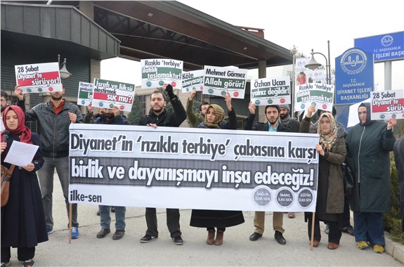İnanç İlke-Sen Genel Başkanı Özhan Uçan’ın Diyanet İşleri Başkanlığı’ndan yaptığı yorumlar sonrası işten atılması nedeniyle İlke-Sen üyeleri, Diyanet İşleri Başkanlığı önünde eylem yaptı. Sendika üyeleri, Uçan’ın işten çıkarılmasına tepki gösterdi. ‘Mehmet Görmez Allah Görür!’ dövizi de dikkatlerden kaçmadı.