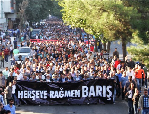 Diyarbakır'ın Bağlar ilçesi Koşuyoyu Parkı'nda bulunan İnsan Hakları Anıtı önünde bir araya gelen grup, siyasi parti temsilcileri, sivil toplum kuruluşlarını başkanları, insan hakları savunucuları öncülüğünde 5 Haziran'da terör örgütü IŞİD'in HDP'nin mitingine bombalı saldırı düzenlediği Yenişehir ilçesindeki İstasyon Meydanı'na kadar yürüdü. Yürüyüşün en önünde 'Her şeye rağmen barış' yazılı büyük bir pankart taşındı.