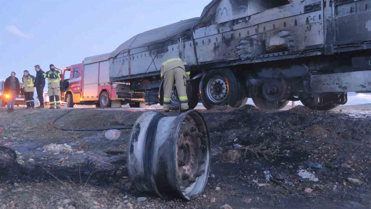 Olay anını anlatan sürücü Taner Gönül, "Teker bilyesi bozulunca ısındı, lastik tutuştu ve ardından patladı. Köylü arkadaşlar sağ olsun, hepsi yardıma geldi. Ben de köylüyüm. Elimize ne geçtiyse; kürekle, suyla müdahale ettik. Köylülerin sayesinde yangını söndürdük. Ereğli’den Karaman’a inşaat malzemesi götürüyordum" dedi.