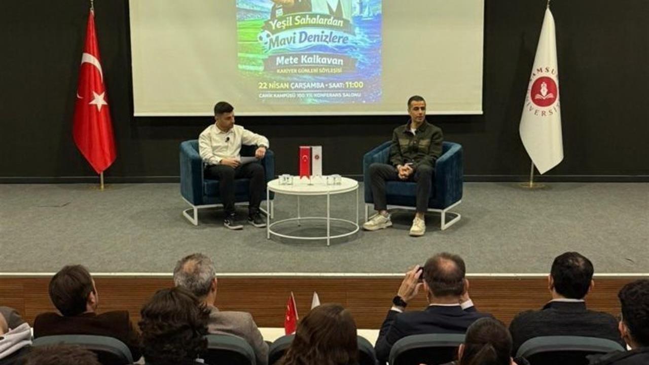 Samsun Üniversitesi Denizcilik İşletmeleri Yönetimi Bölümü tarafından düzenlenen "Yeşil Sahalardan Mavi Denizlere" başlıklı söyleşi programı, saygı duruşu ve İstiklal Marşı'nın okunmasıyla başladı. Programın açılışında Bölüm Başkanı Doç. Dr. Mehmet Selman Kobanoğlu, katılımcılara hitap etti.