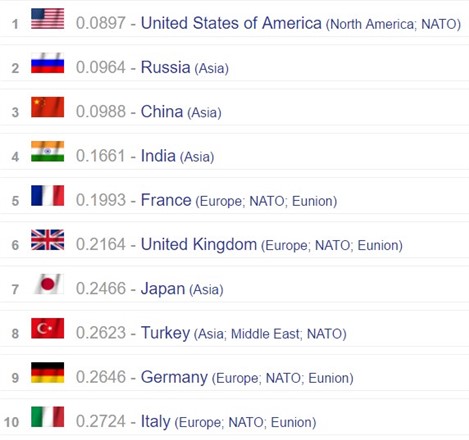 Endekse; askere çağırılabilecek nüfus, tank, uçak, nükleer başlık, uçak gemisi, denizaltı sayısı ve savunma bütçeleri giriyor.