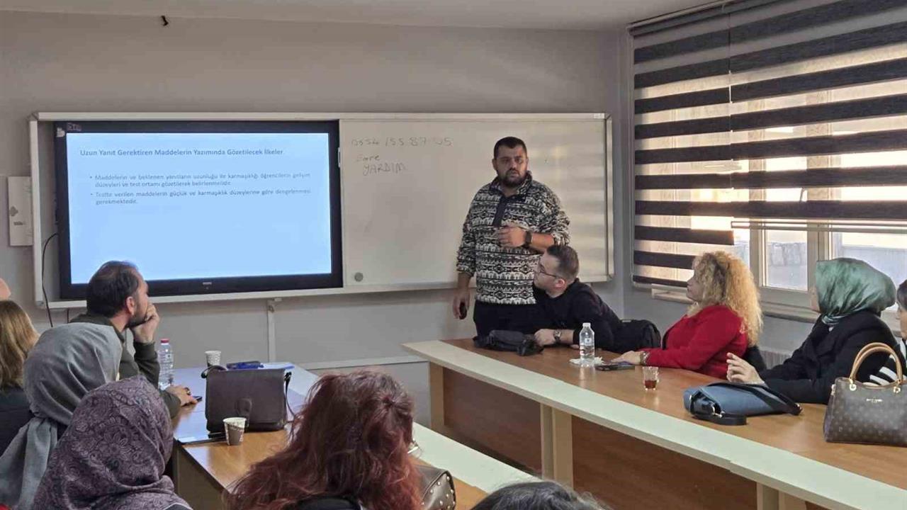 Düzce'de düzenlenen değerlendirme seminerine, il genelinde görev yapan çok sayıda öğretmen katıldı. Seminer, Ölçme Değerlendirme Merkezi tarafından gerçekleştirildi. Programda, açık uçlu soru yazımının temel ilkeleri, ölçme ve değerlendirme süreçlerinde dikkat edilmesi gereken unsurlar üzerinde duruldu. Özellikle Türkiye Yüzyılı Maarif Modeli'nin ölçme anlayışı, katılımcılarla paylaşıldı. Eğitim süresince, öğrencilerin akademik başarılarının yanı sıra gelişim süreçlerinin de sağlıklı bir şekilde izlenmesine yönelik etkili değerlendirme yöntemleri ele alındı. Seminerin, öğretmenlerin mesleki gelişimlerine katkıda bulunması ve ölçme-değerlendirme uygulamalarında birlikteliğin sağlanması açısından önemli bir adım olduğu ifade edildi. Yetkililer, Türkiye Yüzyılı Maarif Modeli doğrultusunda benzer eğitim ve seminerlerin ilerleyen günlerde de devam edeceğini belirtti.