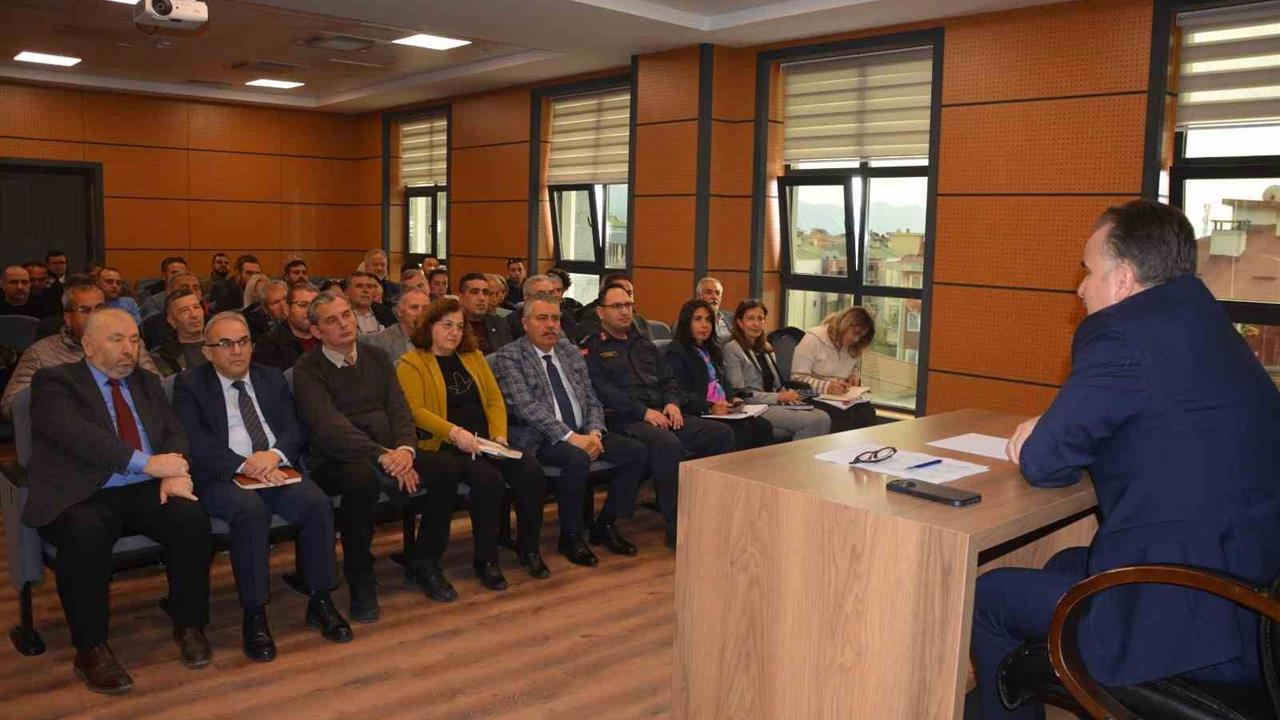Edremit Kaymakamlığı Konferans Salonu'nda düzenlenen toplantıda, 2025 yılının genel durumu değerlendirildi. Kaymakam Ahmet Odabaş'ın başkanlık ettiği toplantıya, İlçe Emniyet Müdürü Burak Lehimer, İlçe Jandarma Komutanı Yarbay Serkan Özdemir ve ilgili kurum müdürleri katıldı. Toplantının ana gündem maddeleri arasında emniyet, eğitim, sağlık ve kamu hizmetleri yer aldı. Kurumlar, 2025 yılı boyunca yürüttükleri çalışmalar hakkında bilgi verirken, 2026 yılına yönelik projeleri de tartışmaya açtılar.
