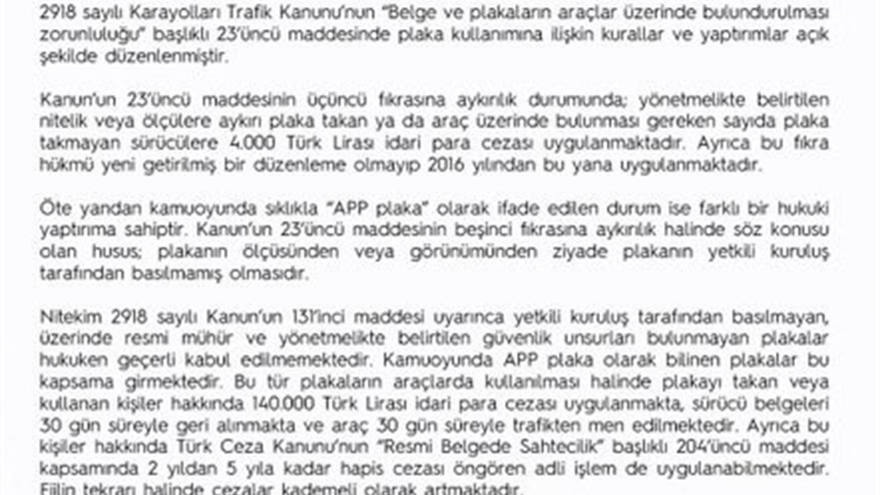 APP plaka olarak ifade edilen durumun farklı bir hukuki yaptırıma sahip olduğu belirtilen açıklamada, "Öte yandan kamuoyunda sıklıkla ‘APP plaka’ olarak ifade edilen durum ise farklı bir hukuki yaptırıma sahiptir. Kanun’un 23’üncü maddesinin beşinci fıkrasına aykırılık halinde söz konusu olan husus; plakanın ölçüsünden veya görünümünden ziyade plakanın yetkili kuruluş tarafından basılmamış olmasıdır. Nitekim 2918 sayılı Kanun’un 131’inci maddesi uyarınca yetkili kuruluş tarafından basılmayan, üzerinde resmi mühür ve yönetmelikte belirtilen güvenlik unsurları bulunmayan plakalar hukuken geçerli kabul edilmemektedir. Kamuoyunda APP plaka olarak bilinen plakalar bu kapsama girmektedir. Bu tür plakaların araçlarda kullanılması halinde plakayı takan veya kullanan kişiler hakkında 140 bin lira idari para cezası uygulanmakta, sürücü belgeleri 30 gün süreyle geri alınmakta ve araç 30 gün süreyle trafikten men edilmektedir. Ayrıca bu kişiler hakkında Türk Ceza Kanunu’nun ‘Resmi Belgede Sahtecilik’ başlıklı 204’üncü maddesi kapsamında 2 yıldan 5 yıla kadar hapis cezası öngören adli işlem de uygulanabilmektedir. Fiilin tekrarı halinde cezalar kademeli olarak artmaktadır" ifadelerine yer verildi.