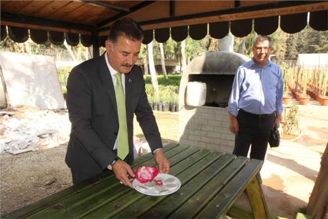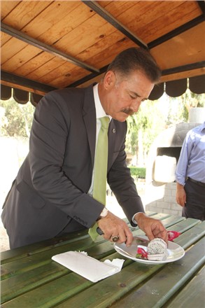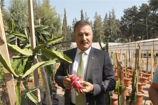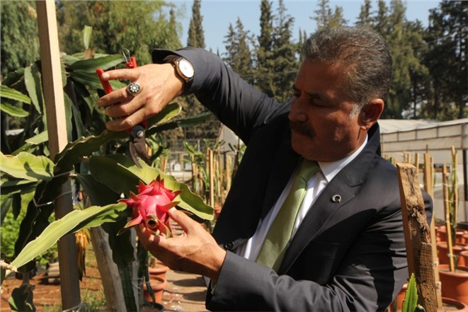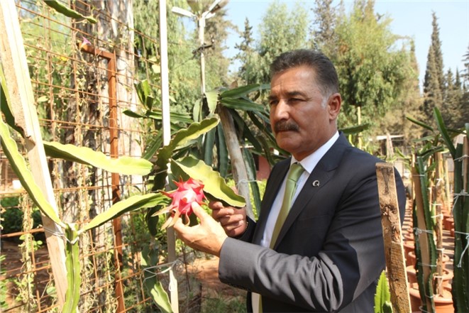 Çiftçileri yeni ürünler üretmeye teşvik etmek amacıyla alternatif tarım çalışmalarına önem veren Toroslar Belediye Başkanı Hamit Tuna, belediye serasını ziyaret ederek ilk ürününü veren ejder meyvesini dalından keserek, tadına baktı.