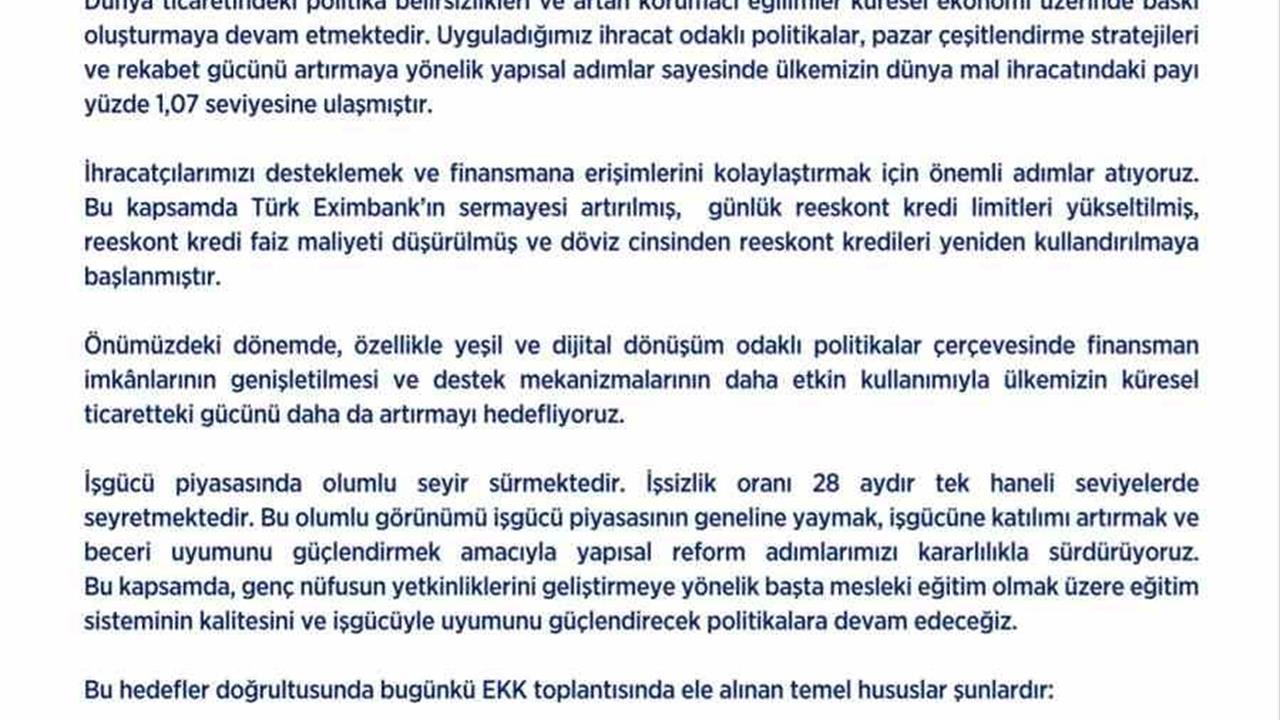 Dünya ticaretindeki belirsizliklere rağmen, ihracat odaklı politikaların etkisiyle Türkiye'nin dünya mal ihracatındaki payının yüzde 1,07 seviyesine ulaştığı ifade edildi. Türk Eximbank'ın sermaye artışı ve finansman desteği ile ihracatçılara yönelik önemli adımlar atıldığı belirtildi. Ayrıca, işsizlik oranının 28 aydır tek haneli seviyelerde seyrettiği ve bu olumlu durumu yaygınlaştırmak için yapısal reformların sürdürüleceği ifade edildi.
