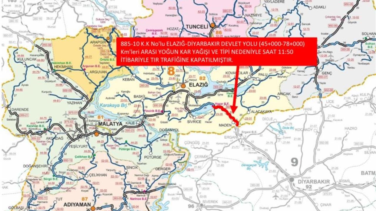 Elazığ ve çevresinde etkili olan kar yağışı nedeniyle ulaşımda aksaklıklar yaşanıyor. Meteorolojik verilerin ışığında, kar yağışının artarak devam etmesi bekleniyor. Bu nedenle, Elazığ-Diyarbakır karayolunun 45-78. kilometreleri arasındaki ağır taşıt trafiği, güvenlik amacıyla geçici olarak kapatıldı. Karayolları Genel Müdürlüğü, yol durumunu takip ederek, gerekli önlemleri alıyor. Olay yerinde, ekipler çevre güvenliğini sağlamak için çalışmalarını sürdürüyor. Yoğun kar yağışı nedeniyle sürücülerin dikkatli olmaları ve belirtilen güzergahlardan uzak durmaları tavsiye ediliyor.