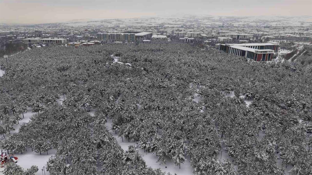 Elazığ’da etkili olan kar yağışı, şehrin kalbinde beklenmedik bir kış manzarası sundu. Fırat Üniversitesi kampüsündeki ormanlık alan, yoğun kar örtüsüyle kaplanarak adeta bir kış bahçesine dönüştü. Bu görüntüler, şehirdeki beton yapılar arasında yükselen beyaz örtüyle görsel bir zenginlik sağladı. Özellikle Zübeyde Hanım Caddesi’nin hemen yanında yer alan bu ormanlık bölge, havadan çekilen fotoğraflarla daha da dikkat çekti. Kar yağışı sonrası oluşan bu sahneler, Elazığ’ın yoğun yapılaşmış alanında nadir görülen bir doğa manzarası sundu. Özellikle şehrin işlek noktalarından birinde bulunan bu ormanlık alan, dağ yollarını andıran kar yoğunluğu ile dikkat çekti. Görüntüler, hem yerel halk hem de ziyaretçiler için büyüleyici bir deneyim sunuyor.