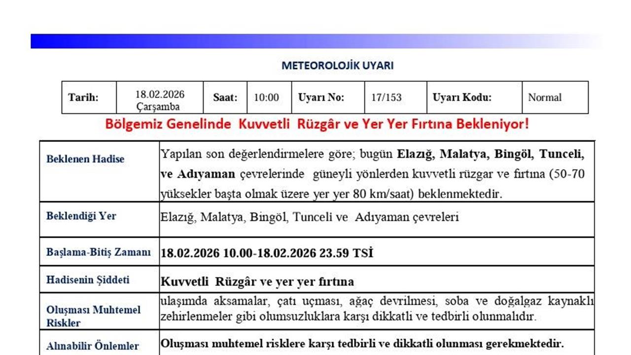 Meteoroloji 13. Bölge Müdürlüğü tarafından yapılan açıklamada, "Son değerlendirmelere göre; bugün Elazığ, Malatya, Bingöl, Tunceli ve Adıyaman çevrelerinde güney yönlerden kuvvetli rüzgar ve yer yer fırtına (50-70 km/saat, yüksek kesimlerde ise 80 km/saat) beklenmektedir. Ulaşımda aksaklıklar, çatı uçmaları, ağaç devrilmeleri, soba ve doğalgaz kaynaklı zehirlenmelere karşı dikkatli olunması gerekmektedir" denildi. Meteoroloji, vatandaşların olumsuz hava koşullarına karşı tedbirli olmalarını önerdi.