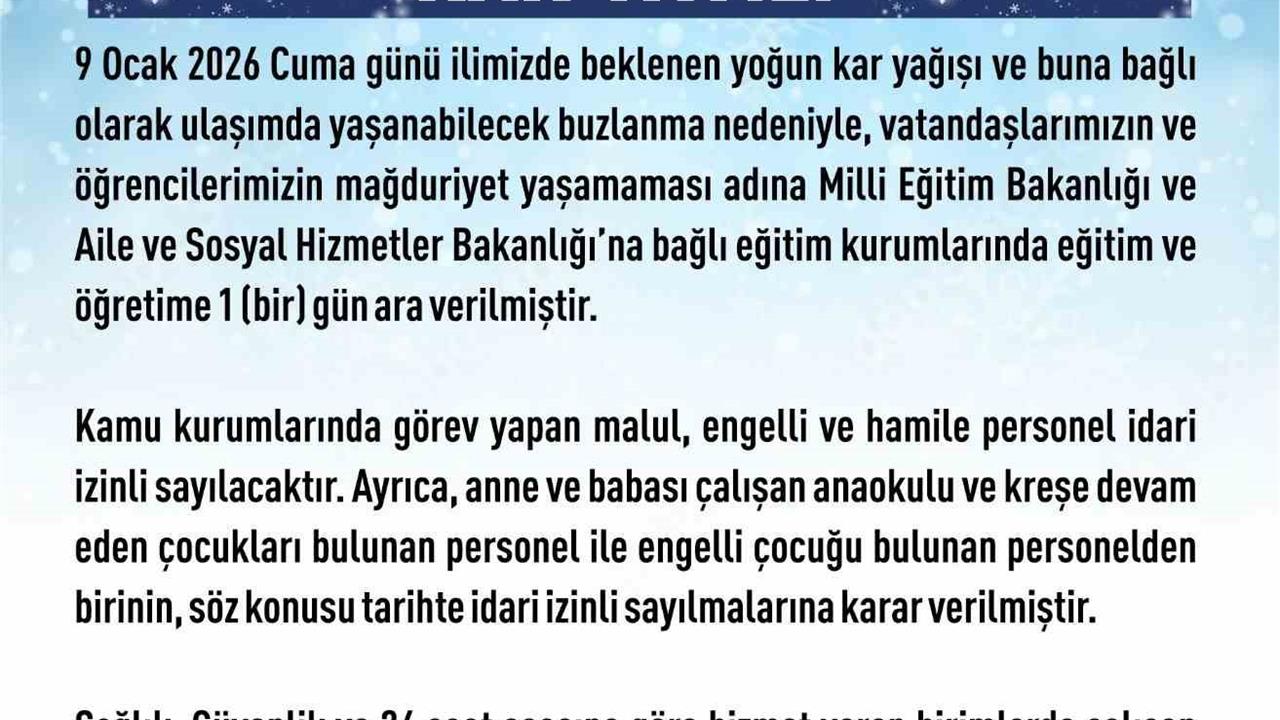 Elazığ Valiliği tarafından yapılan açıklamada, 9 Ocak 2026 Cuma günü il genelinde beklenen yoğun kar yağışı sebebiyle ulaşımda meydana gelebilecek buzlanmanın önüne geçmek amacıyla eğitim ve öğretime 1 gün ara verileceği belirtildi. Bu kararın, vatandaşların ve öğrencilerin mağduriyet yaşamaması adına alındığı ifade edildi.
