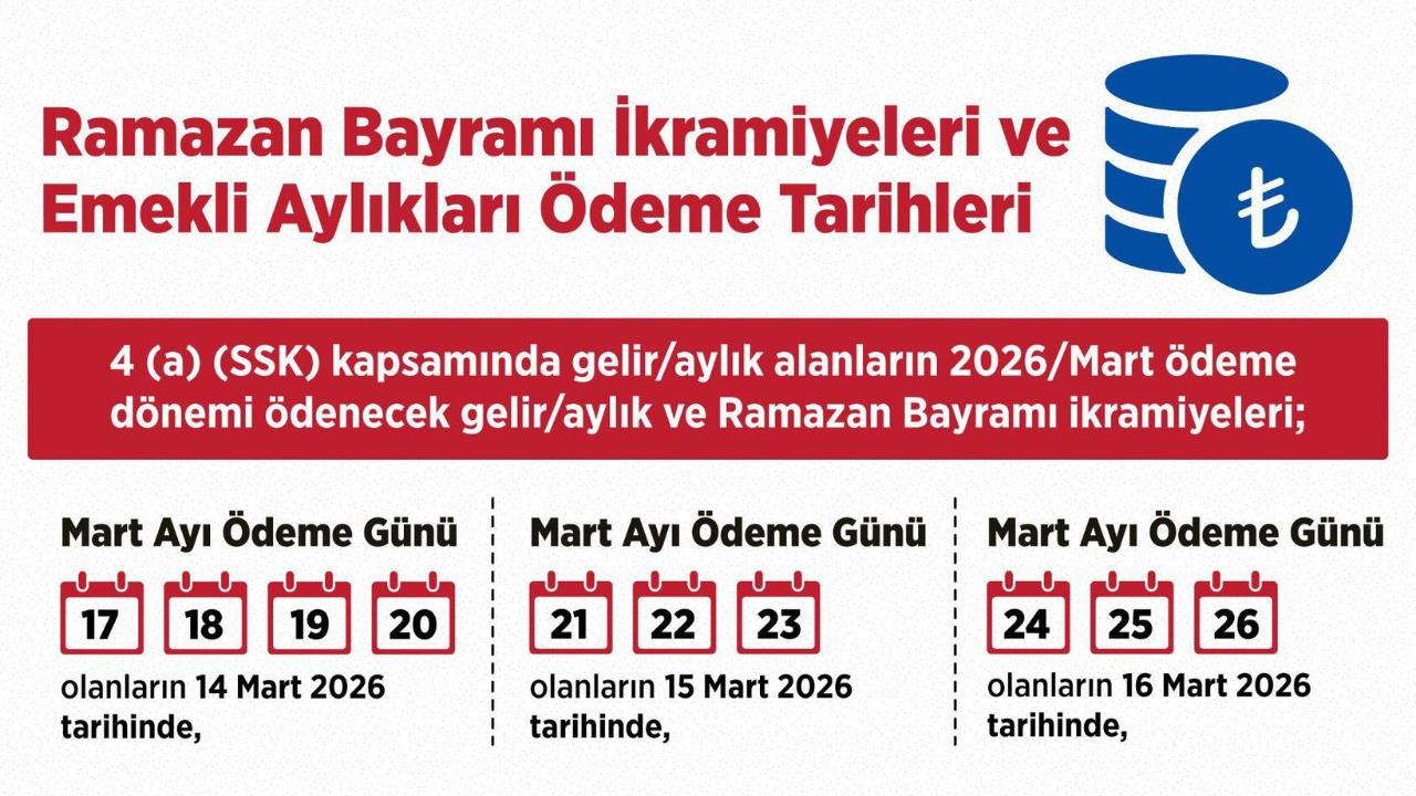 Emekli vatandaşlarımızın bayram ikramiyeleri ve aylık ödemeleri Ramazan Bayramı öncesinde 14 Mart ile 19 Mart tarihleri arasında banka hesaplarını yatırılacağını açıklayan Bakan Işıkhan, "Ülkemizin emektarları kıymetli emeklilerimiz ve aileleri için hayırlı olmasını diliyorum" dedi.