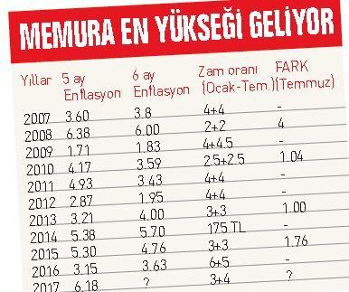 Yaklaşık 3 milyon memur ile birlikte memur emeklilerinin de gözü temmuz ayına çevrilmiş durumda. Dün açıklanan enflasyon rakamları memur ve memur emeklilerinin temmuzda enflasyon farkı ile birlikte çifte zam alacağını kesinleştirdi. Memur ve memur emeklileri temmuz ayında yüzde 4 oranında toplu sözleşme zammı alacak. Buna ocak ayındaki yüzde 3 zam oranının üzerindeki enflasyon farkı da eklenecek. Dün açıklanan 5 aylık enflasyon yüzde 6.18 olduğu için memur ve memur emeklileri için de fark yüzde 3.18 oldu. Toplam zam 7.18'e ulaştı. Haziran enflasyonunun beklenti anketlerine göre 0.30 olarak ilave edilmesiyle fark 3.48'e zam oranı ise 7.48'e çıkacak.