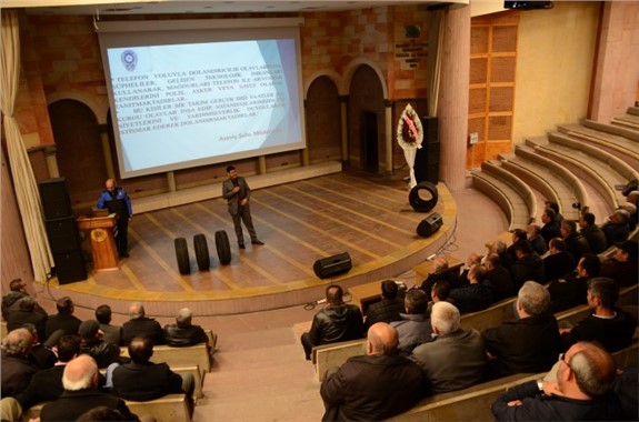 Toplantıya katılanlara Asayiş Şube Müdürlüğü Yankesicilik ve Dolandırıcılık Büro Amiri Komiser Yardımcısı Mustafa Aşçı tarafından 'Telefon Dolandırıcılığı' ile ilgili olarak sunum yapıldı. Vatandaşların konu ile ilgili soruları cevaplandırılırken, Toplum Destekli Şube Müdürlüğü personeli tarafından bilgilendirici broşür dağıtımı yapıldı.