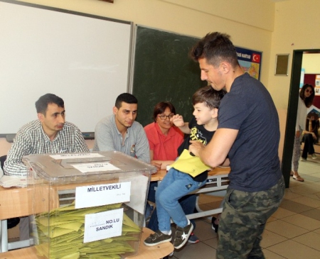 Fenerbahçe'nin yıldız futbolcusu Emre Belözoğlu, eşi Tuğba ve oğlu Ömer Akif ile birlikte oy kullanmak üzere Beykoz'daki Sedat Simavi İlkokulu'na gitti. Sınıfa gelen aile, sıralarının gelmesini bekledi. Sıra gelince oyunu kullanan Belözoğlu, oy pusulasının bulunduğu zarfı oğlu Ömer Akif'e verdi. Küçük Ömer, babasının yardımıyla zarfı 1270 numaralı sandığa attı.