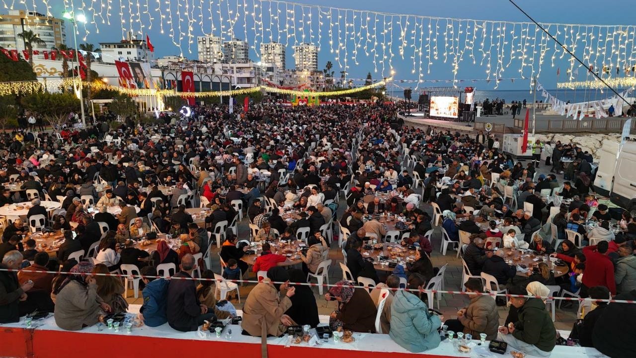Tüm Türkiye’de olduğu gibi Mersin’in Erdemli ilçesinde de binlerce kişi aynı sofrada buluştu. Deniz kenarında kurulan sofralarda yaklaşık 10 bin kişi ellerini semaya kaldırarak dua etti ve oruçlarını birlikte açtı.
