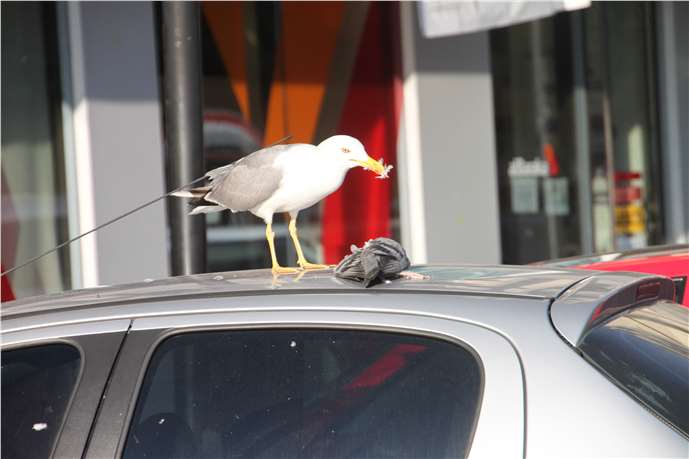 Zonguldak'ın Ereğli ilçesinde aç kalan bir martı, göğüs göğüse bir mücadeleyle yakaladığı güvercini otomobilin üzerinde parçaladı.