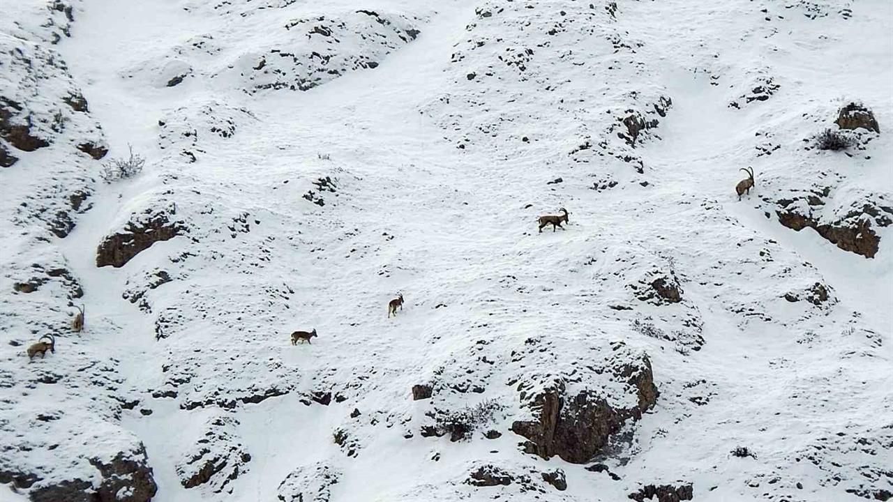 Erzincan ile Tunceli arasında yer alan Munzur Dağları, 3 bin 300 rakıma kadar ulaşan zirveleriyle dikkat çekmektedir. Bu yüksekliklerde, dağ keçileri sürü halinde dolaşırken, bazen daha aşağıdaki rakımlara da inerek gözlemlenmektedir. Çengel boynuzlu dağ keçileri, karlı alanlarda gezinirken havadan çekilen görüntülerde belirgin bir şekilde yer aldı. Bu türün, çevresel koruma açısından önemi büyük olup, avlanması yasaktır. Ayrıca, bu hayvanlar, Dünya Doğa Koruma Birliği'nin (IUCN) hazırladığı Nesli Tükenme Tehlikesi Altında Olan Türlerin Kırmızı Listesi'nde yer almaktadır. Bu nedenle, dağ keçilerinin korunması ve yaşam alanlarının sürdürülebilirliği, doğa koruma çalışmaları açısından büyük bir öneme sahiptir.