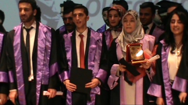 Erzurumlu ev hanımı Arzu Odabaş, 52 yaşında Kazım Karabekir Eğitim Fakültesi Türkçe Öğretmenliği bölümünü başarıyla tamamladı. Mezuniyet töreni, Atatürk Üniversitesi Nene Hatun Kültür Merkezi'nde gerçekleştirildi. Törende, diplomasını oğlu Ensar Odabaş ve 6 yaşındaki torunu Burak Kutay Yolcu'nun elinden alan Odabaş, bu anın kendisi için özel olduğunu belirtti. Eşinin ikinci fakültesini tamamlamak üzere olduğunu, oğlunun da üniversite mezunu kızının üniversiteye hazırlandığını ifade eden Arzu Odabaş, “Bugün hem okulumu bitirmenin hem de diplomamı torunumun elimden almanın mutluluğunu yaşıyorum” dedi. Sınıf arkadaşlarıyla birlikte kep atan Arzu Odabaş, ardından hatıra fotoğrafları çektirdi.