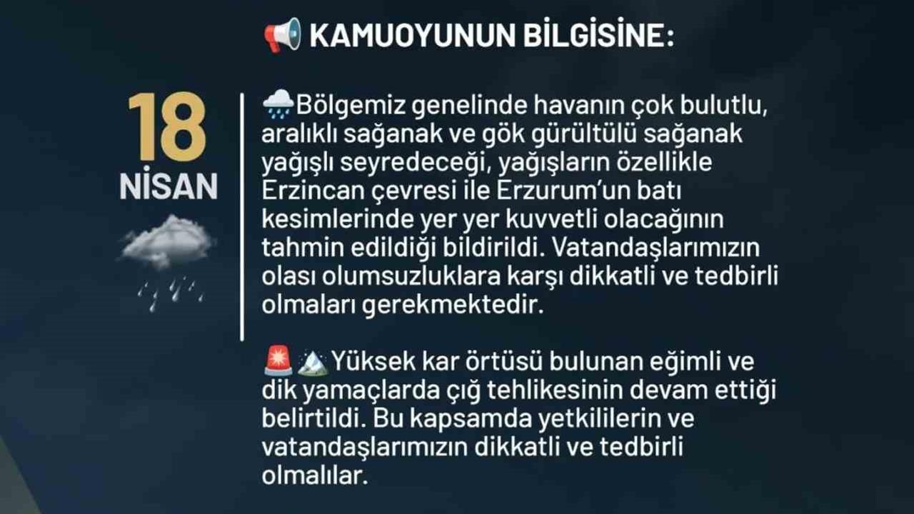 Erzurum ve çevresinde havanın çok bulutlu olması bekleniyor. Aralıklı sağanak ve gök gürültülü sağanak yağışların özellikle Erzincan çevresinde ve Erzurum'un batı kesimlerinde yer yer kuvvetli olacağı tahmin ediliyor. Valilik tarafından yapılan açıklamada, yüksek kar örtüsü bulunan eğimli ve dik yamaçlarda çığ tehlikesinin sürdüğü belirtildi. Bu nedenle, yetkililerin ve vatandaşların her zaman dikkatli ve tedbirli olmaları gerektiği ifade edildi. Yağışların etkisiyle ortaya çıkabilecek olumsuz durumlara karşı hazırlıklı olunması gerektiği vurgulandı.