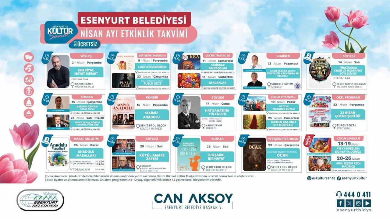 Esenyurt Belediyesi, bu ay boyunca farklı etkinliklerle vatandaşları bir araya getirecek. 13 Nisan Pazartesi günü saat 12.30’da "Adam Olacak Çocuk Üniversite Kapısında mı Geçmeli?" başlıklı bir seminer düzenlenecek. 14 Nisan Salı günü 10.30-12.00 saatlerinde "Türkülerle Tarih ve Medeniyet Söyleşileri" gerçekleştirilecek. 17 Nisan Cuma günü saat 14.30’da "Hat Sanatına Yolculuk" söyleşisi düzenlenecek. Ayrıca, 28 Nisan Salı günü saat 14.00’te "Kût’ül-Amâre Zaferi" söyleşisine tarih meraklıları davet edilecek.