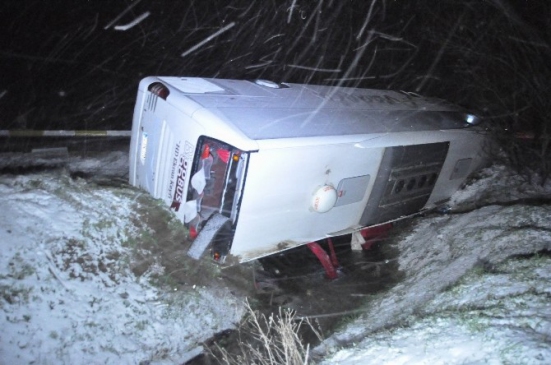 Eskişehir-Kütahya Karayolu’nun 25’inci kilometresinde, kar yağışı nedeniyle kayganlaşan yolda, Mustafa T. yönetimindeki 64 AN 120 plakalı yolcu otobüsü dere kıyısına yan yattı. Kazada şoförün yanı sıra 12 yolcu yaralandı. Yaralılardan 9’u başka bir yolcu otobüsü tarafından Eskişehir Osmangazi Üniversitesi Tıp Fakültesi Hastanesi’ne götürüldü. Üç yolcu ise olay yerine ulaşan 112 Acil Sağlık ekipleri tarafından Eskişehir Devlet Hastanesi’ne taşındı. Yedek şoför de Eskişehir Yunus Emre Devlet Hastanesi’ne kaldırıldı. Şoför Mustafa T. kazayı yara almadan atlattı. Ayrıca, kaza sonrası 110 İtfaiye ekipleri çevredeki su akıntısını kontrol ederek arama yaptı; ancak yaralı yolcu bulunamadı. Hastanelerde tedavi altına alınan yaralıların hayati tehlikesinin bulunmadığı bildirildi.