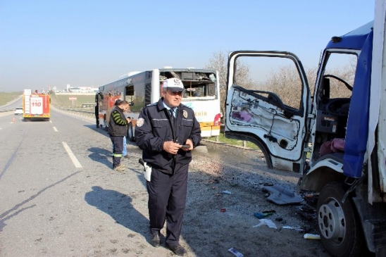Eskişehir-Bursa karayolunun 10’uncu kilometresinde gerçekleşen kazada, Mustafa A. yönetimindeki 26 PN 337 plakalı kamyonet, yolcu indiren Suat T. idaresindeki 26 E 2804 plakalı özel halk otobüsüne arkadan çarptı. Çarpmanın etkisiyle kamyonette sıkışan sürücü ve yolcular C.Ç., C.A. ve Ü.Ö. itfaiye ekipleri tarafından kurtarıldı. Kaza sonrası çevre yolundaki trafik, polis ve jandarma ekipleri tarafından kontrollü bir şekilde sağlandı. Yaralanan 4 kişi, 112 Acil Servis ekiplerinin müdahalesinin ardından çeşitli hastanelere kaldırılarak tedavi altına alındı. Olayla ilgili soruşturma başlatıldığı bildirildi.