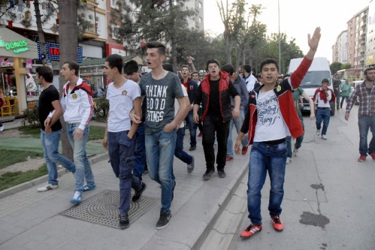 Eskişehir'de taraftarlar, Galatasaray-Beşiktaş derbisini protesto ederek şehir merkezinde yürüyüş yaptı. Yaklaşık 150 kişilik bir grup, karşılaşmayı izlemek isteyenlere tepki gösterdi.