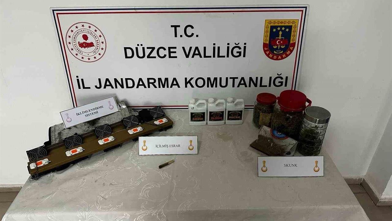 Düzce'de iklimlendirme sistemi kullanarak kenevir yetiştiren iki kardeş jandarma tarafından yakalandı. Baskın sırasında evde 530 gram Skunk ve diğer uyuşturucu üretim malzemeleri ele geçirildi.