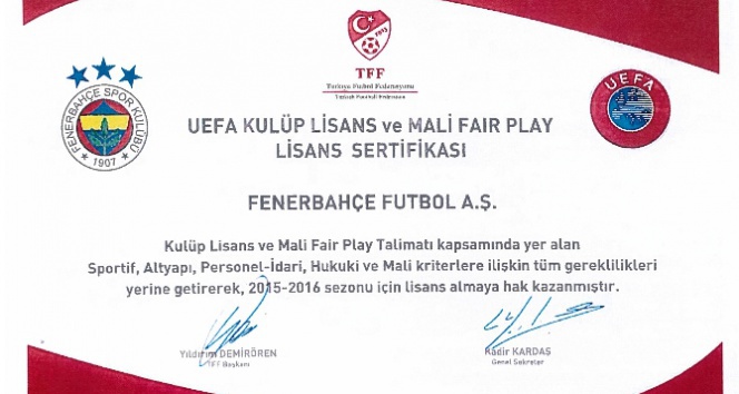 Fenerbahçe Kulübü, Türkiye Futbol Federasyonu Kulüp Lisans Kurulu'nun kararı doğrultusunda UEFA Kulüp Lisansı ve Mali Fair Play Lisansını almaya hak kazandı. Kulüpten yapılan açıklamada, Türkiye Futbol Federasyonu tarafından iletilen yazıda, "Fenerbahçe Futbol A.Ş., Kulüp Lisans ve Mali Fair Play Talimatı çerçevesinde Sportif, Altyapı, Personel-İdari, Hukuki ve Mali kriterleri yerine getirerek 2015-2016 sezonu için lisans almaya hak kazanmıştır" ifadelerine yer verildi. Bu gelişme, kulübün uluslararası arenada daha sağlam adımlar atmasına katkı sağlayacak.